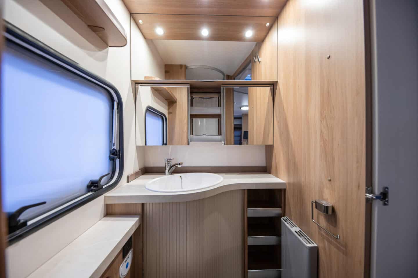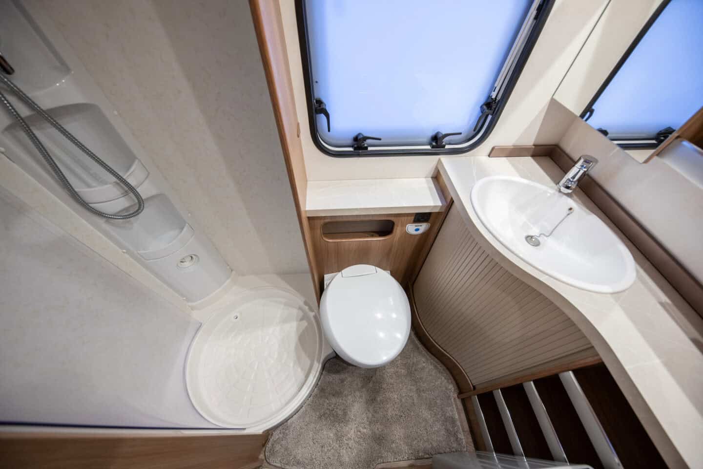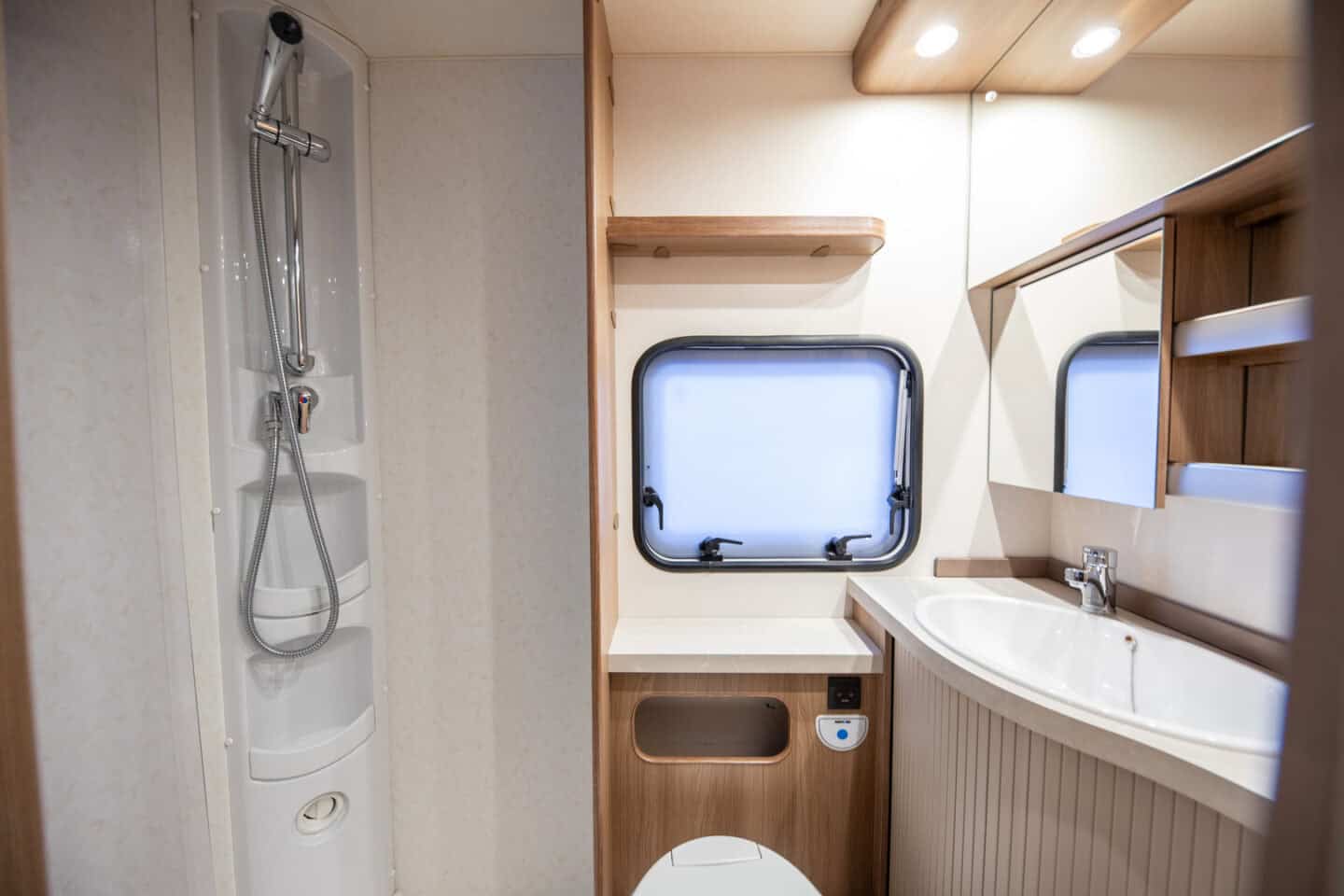 Eraldi dušinurk, kassett-tualett ja valamu muudavad pesemise lihtsaks ja mugavaks. See suurendab reisimugavust eriti pikematel sõitudel, kus oma pesuruum on väärtuslik osa terviklahendusest.
