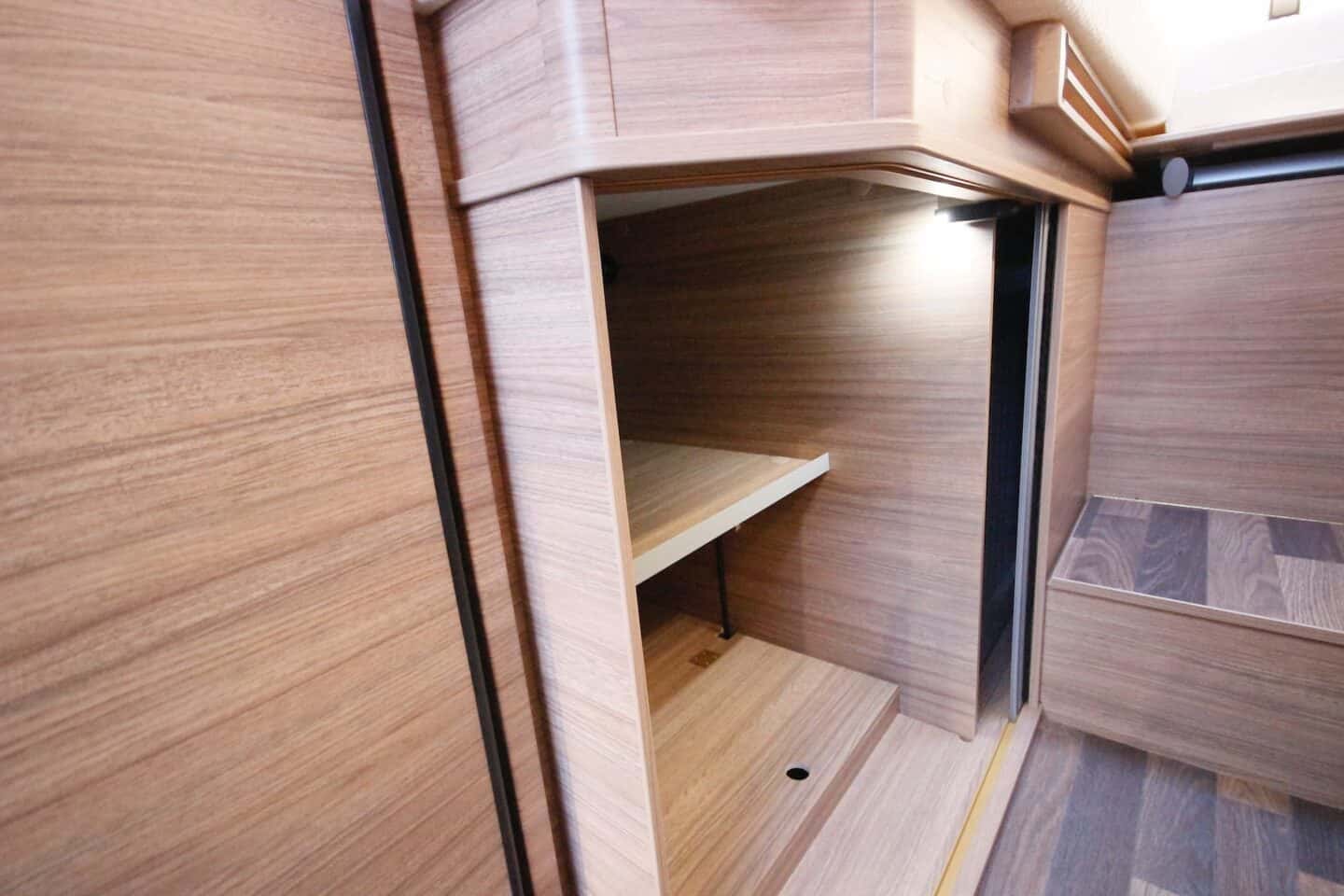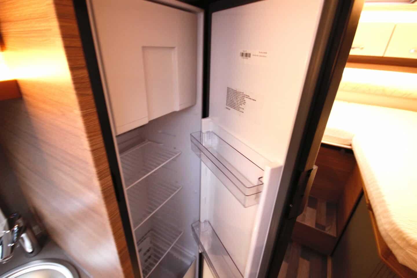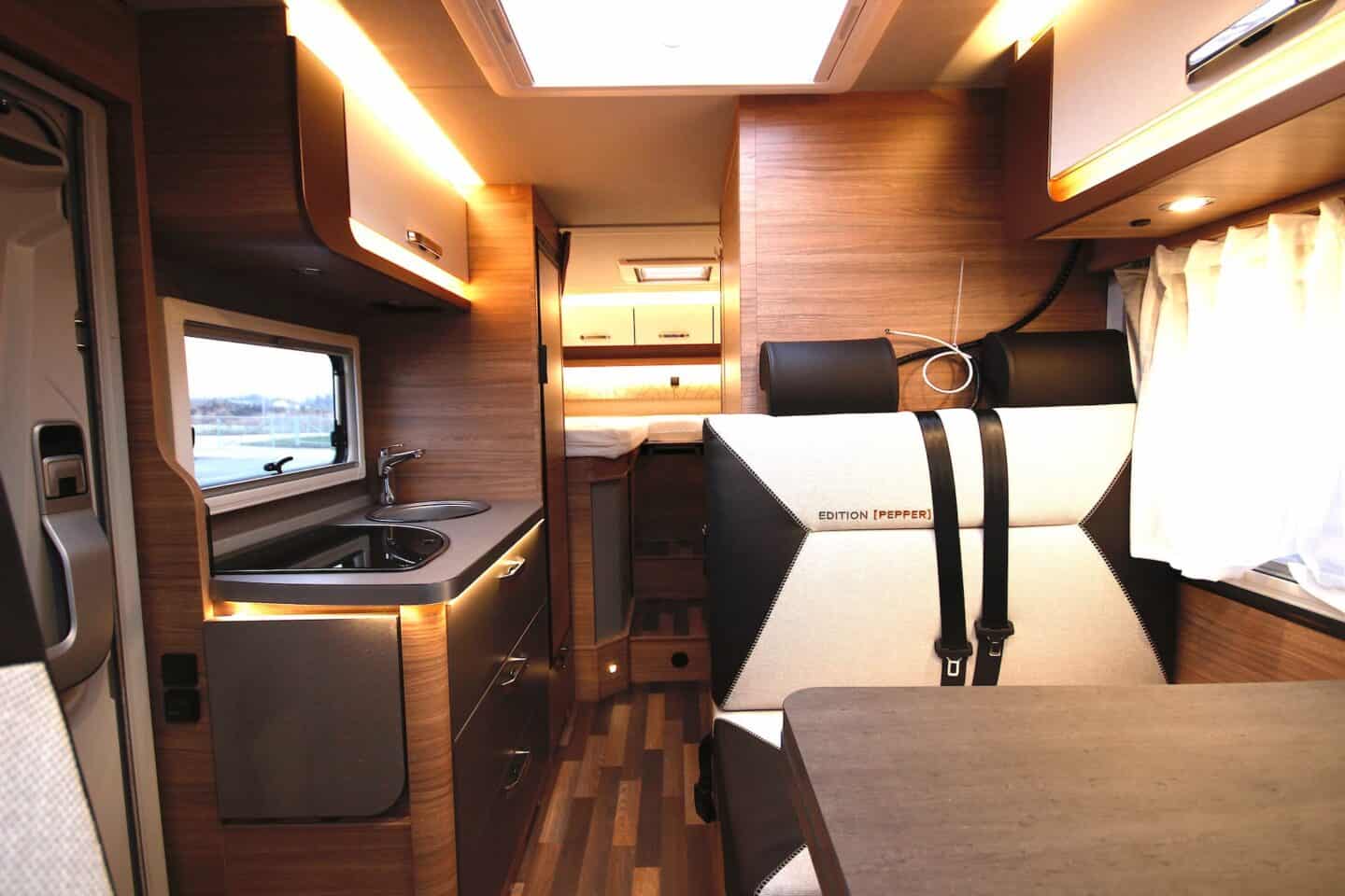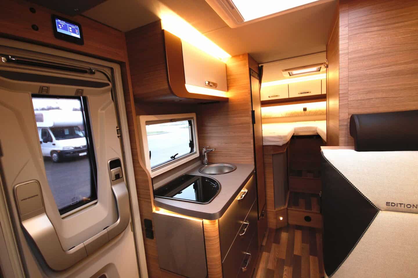 Kolme põletiga pliit, 142-liitrine külmik ning kokkupandav lisatasapind teevad köögi praktiliseks ka pikematel reisidel. LED-valgustusega meeleoluvalgustus lisab hubasust.